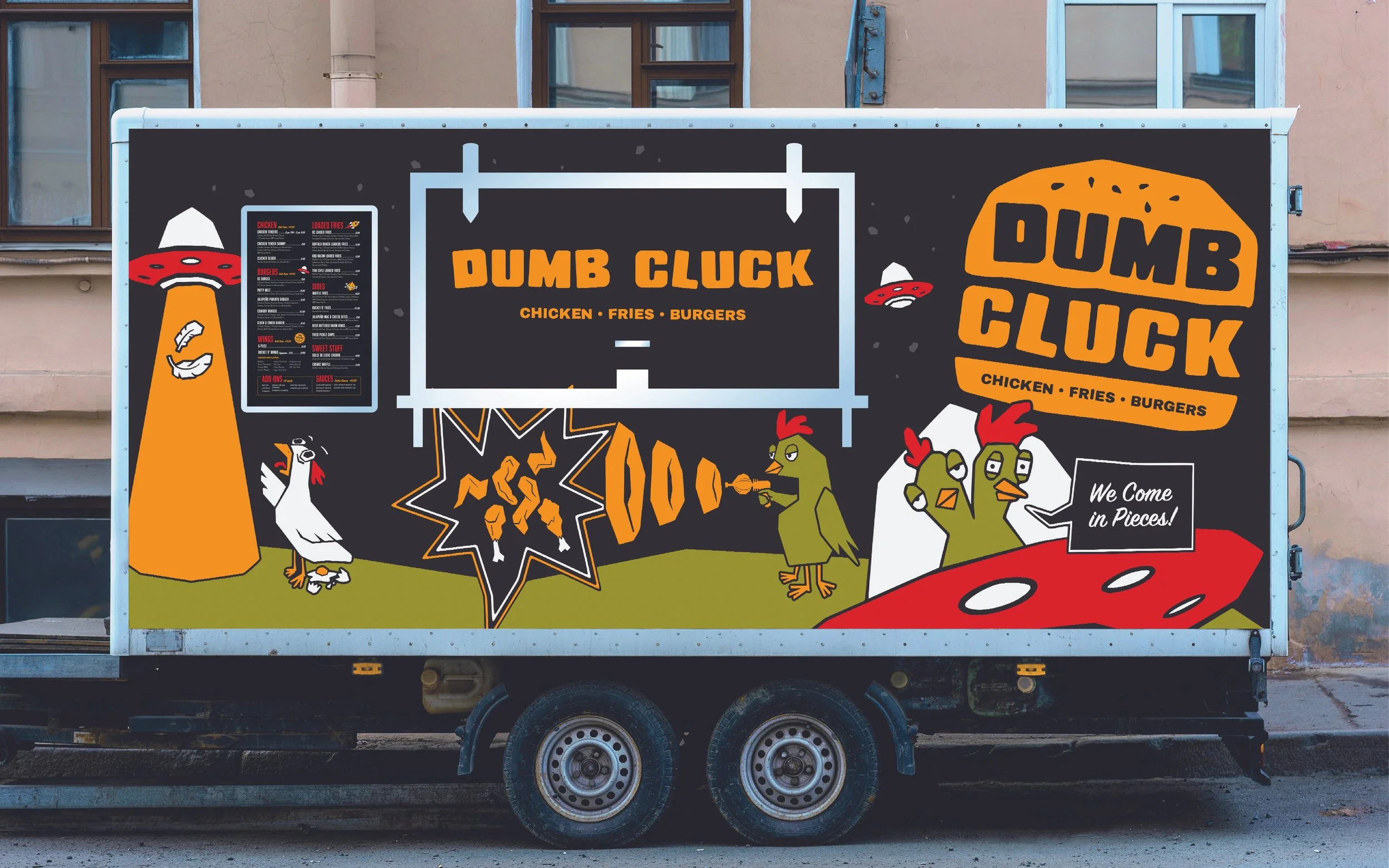 Shady’s Corner, a bar in Chattanooga, TN, bought a food trailer knowing they wanted a cheeky chicken restaurant in it called Dumb Cluck. The only constraints provided were to have the same brand colors and fonts as Shady’s Corner.