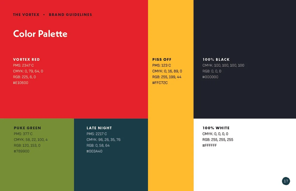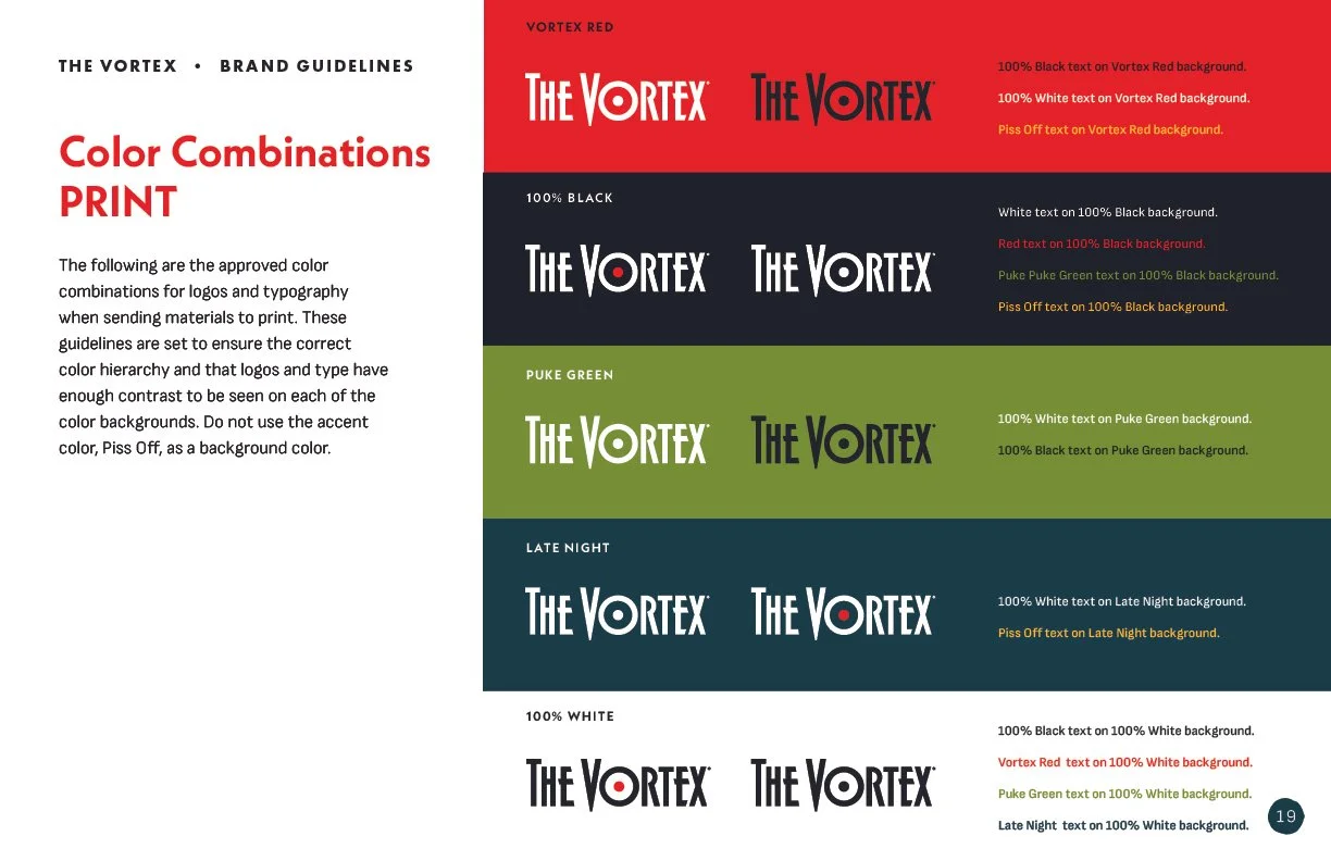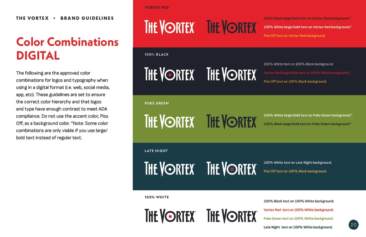 We delivered an updated brand system that feels both fresh and authentic to The Vortex’s legacy. The addition of more color and vortex illustrations expanded what can be created. The new menu and website are easier to navigate.